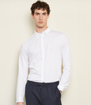 100% mercerised cotton. Italian spread collar.Self colour buttons.Back yoke.Two button adjustable cuffs with button on cuff gauntlet.Curved hem.Unbranded size label.