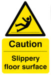 Caution Slippery floor surface Safety Sign , Self Adhesive Vinyl backing , Sticks to most surfaces , Can be wiped clean , 200 x 300mm , Packed in fives